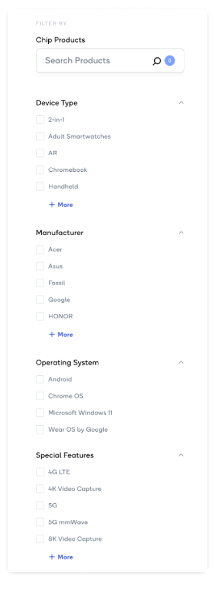 In addition to the tool discoverability level, the finder’s visual experience was flawed. On the front end, the device finder’s visual design was not aligning with Qualcomm’s design system. Lastly, the taxonomy was organized poorly, via content management system tagging, and resulted in a poor filtering experience to the user.